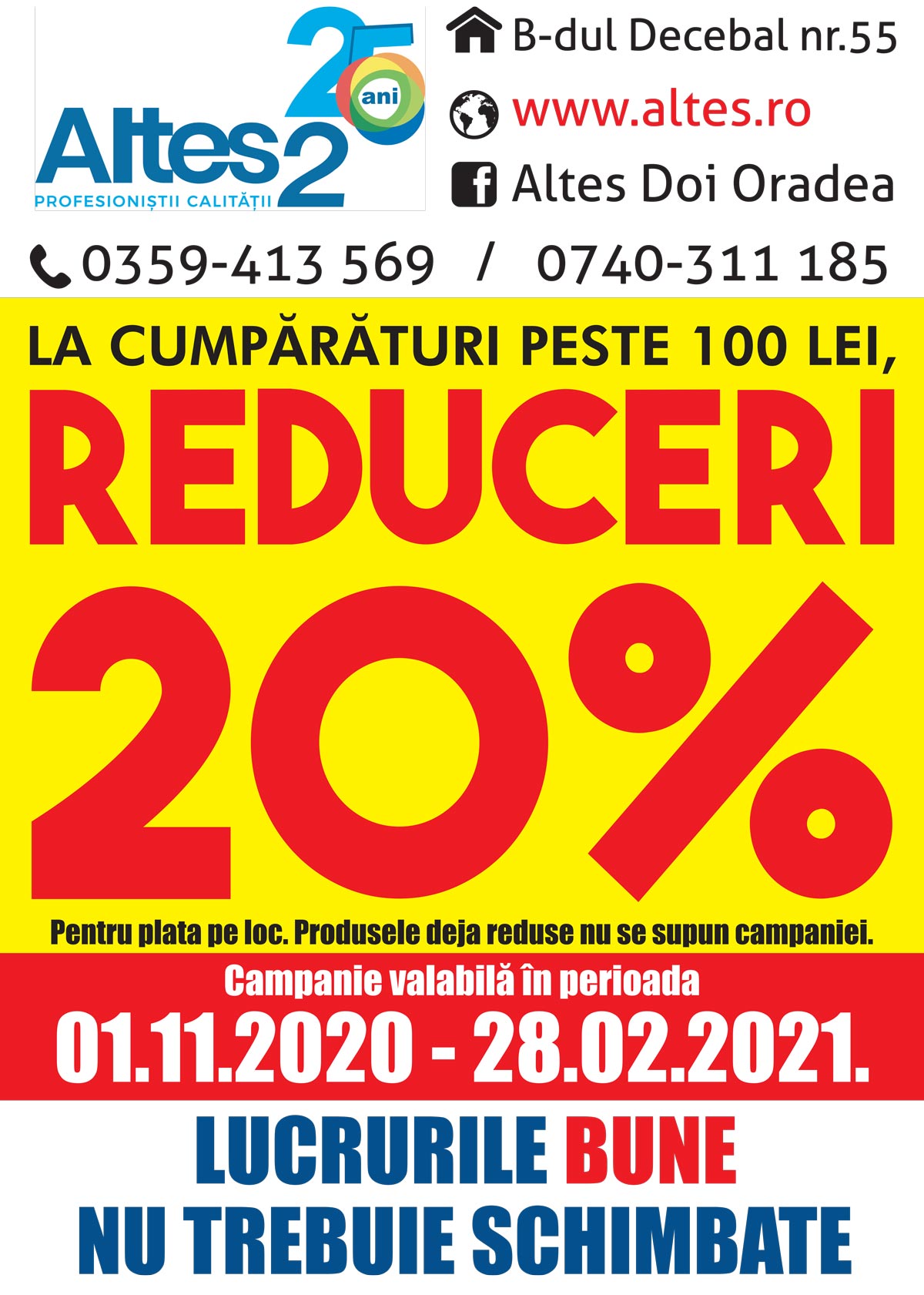Pentru a beneficia de acesta oferta, te asteptăm de luni până vineri în intervalul 08 – 20 şi sâmbăta de la 08 – 18 în magazinul ALTES2, B-dul Decebal nr. 55.